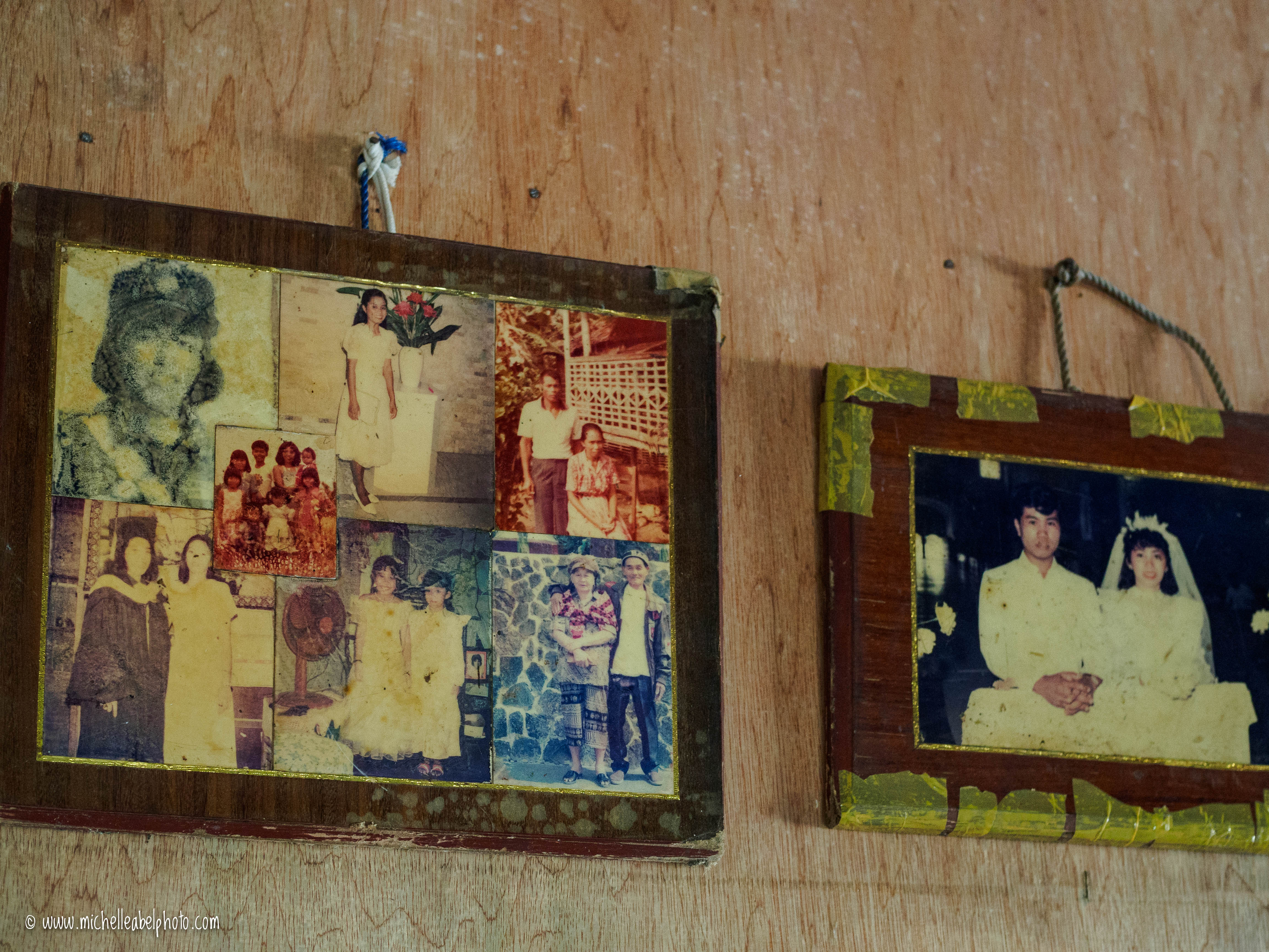 This is Theresa. She is a mother to 10 children, who have given her 60 grandchildren. During Typhoon Haiyan Theresa and her husband lost their home and lived in a small shelter made of salvaged timber. This shelter is now leaning against their new house, and they use it as a simple kitchen. On the day I visited it was hot and sunny outside. Inside there was a cool floor, and a cool breeze. The house was spotless, and empty. Other than a few photos and a few pieces of furniture, Therese and her husband lost everything else. There is one chair beneath some precious photos hanging on the wall. Theresa explained to me the stories behind some of the faces in the photographs on the wall.